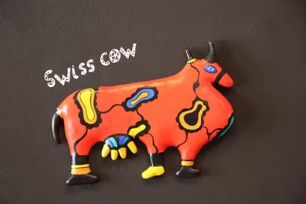 “Swiss Cow” by Niki de Saint Phalle in the Espace Jean Tinguely Niki de Saint Phalle gallery in Fribourg (Freiburg), Switzerland.