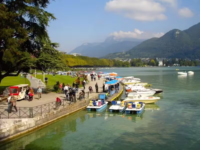 Boating is very popular on Lake Annecy in Haute Savoy, France. The lake is very shallow close to Annecy town and warms up fast in summer for pleasant swimming.