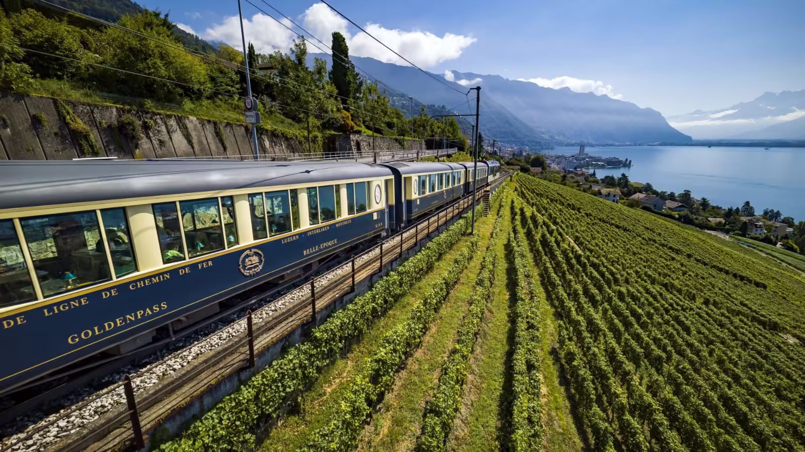 Golden Pass Belle-Epoque train passing through the vineyards en route to Montreux on Lake Geneva in Switzerland.